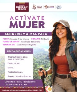 La actividad se llevará a cabo el próximo sábado 21 de febrero en punto de las 7:00 a.m, teniendo como punto de inicio las Maxiletras de Sayulita. El recorrido contempla una distancia aproximada de 5 a 7 kilómetros, con un nivel de dificultad fácil/principiante, por lo que está dirigido a todas las mujeres del municipio que deseen participar.
